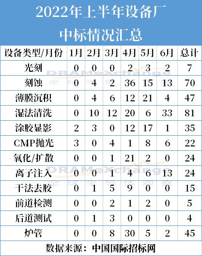 而結(jié)合中標數(shù)據(jù)看,2022 年上半年國內(nèi)主要設備廠共中標379臺工藝設備,濕法清洗設備81臺,數(shù)量排名第一,中標較多廠商為北方華創(chuàng)、中微公司、拓荊科技、芯源微、盛美上海等。