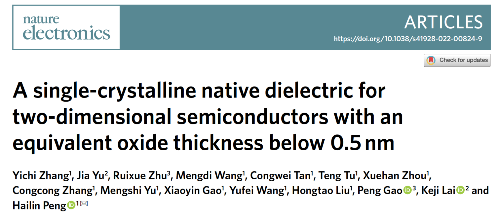 該研究成果于2022年9月15日在線發(fā)表在《自然-電子學(xué)》(Nature Electronics 2022, https://doi.org/10.1038/s41928-022-00824-9)。北京大學(xué)化學(xué)與分子工程學(xué)院彭海琳教授為該論文的通訊作者,第一作者為北京大學(xué)化學(xué)與分子工程學(xué)院博士研究生張亦弛。其他主要合作者還包括德州大學(xué)奧斯汀分校物理系賴柯吉教授、北京大學(xué)物理學(xué)院高鵬教授等。Nature Electronics期刊每期會(huì)挑選論文邀請(qǐng)作者撰寫研究簡(jiǎn)介(Research Briefing),與研究論文同期在線刊出,方便讀者更好地理解重要成果。彭海琳教授和張亦弛同學(xué)代表論文作者發(fā)表了題為“Producing ultrathin monocrystalline native oxide dielectrics f2D transistors(為二維晶體管制備超薄單晶自然氧化物介電層)”的研究簡(jiǎn)介,簡(jiǎn)要介紹了此項(xiàng)研究的背景、過(guò)程、發(fā)現(xiàn)和意義。