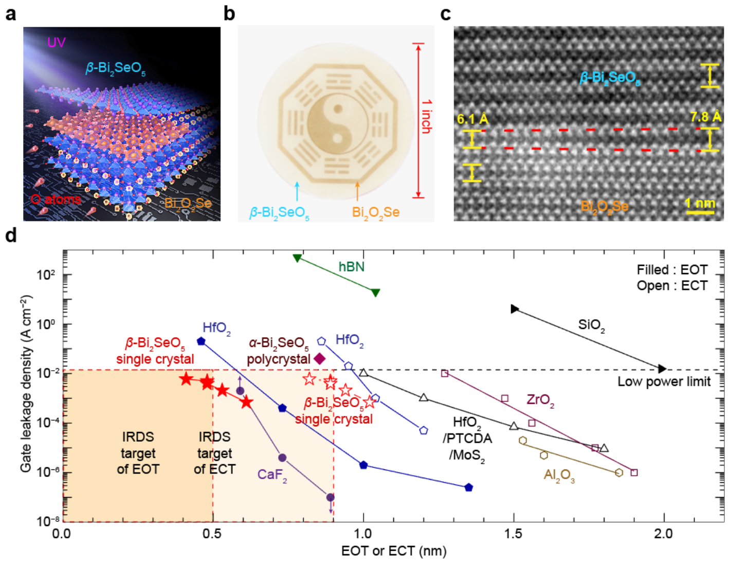 單晶柵介質(zhì)β-Bi2SeO5在漏電流滿足業(yè)界低功耗器件要求的同時(shí),等效氧化層厚度可以微縮到滿足業(yè)界要求的亞0.5納米水平,相對(duì)于商用HfO2、hBN、CaF2、熱氧化多晶α-Bi2SeO5等各種柵介質(zhì),在等效厚度與絕緣性方面均具有優(yōu)勢(shì)(圖1d)。該項(xiàng)研究成果彌補(bǔ)了二維半導(dǎo)體在超薄柵介質(zhì)集成方面的短板,對(duì)二維電子器件的發(fā)展具有重要意義。