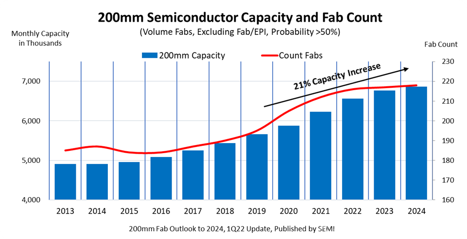 200mm installed semiconductor capacity and fab count, 2013 to 2024*